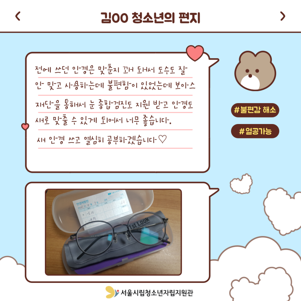가정 밖 청소년들의 맞춤 안경 제작을 지원받았습니다.