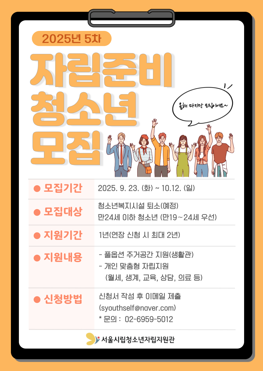 서울시립청소년자립지원관(혼합형)에서 2025년 5차 자립 지원이 필요한 가정 밖 청소년(19~24세 우선)을 모집합니다.