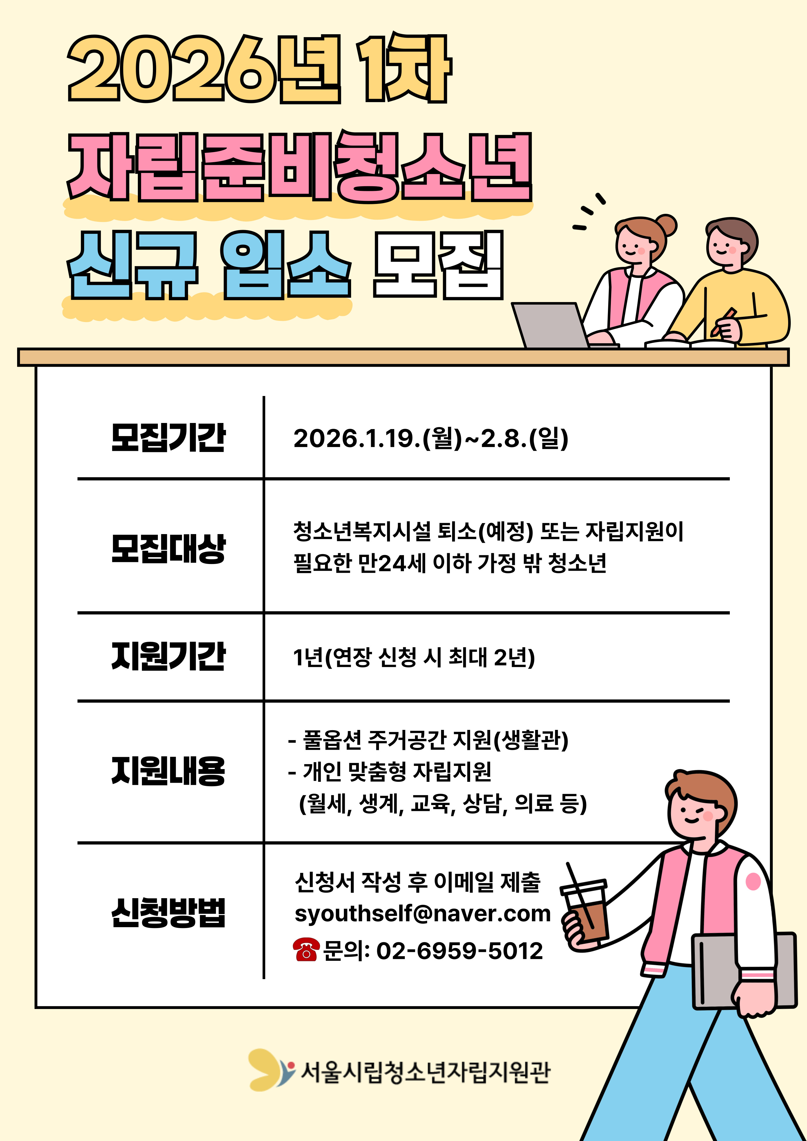 2026년 1차 자립준비청소년 모집이 1/19(월)~2/8(일)까지 진행됩니다.